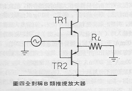 如 果設計線路時,我們仍採用如前述 A 類同一中等功率晶體管,但卻讓其工作於零偏壓情況下,則結果由轉移特性曲線(同圖一),我們可看到圖一中的輸出波形(b)所示,不只有一半波形因晶體管截 止而被削去成如半波整流器那樣,同時如輸入為小訊號時,由於晶體管的半個週期內,皆工作於特性曲線的彎曲部份,所以在這半週的輸出電流波形也將被嚴重畸 變,這就是典型的單端 B 類放大級的運用情況。實用的 B 類輸出電路,如圖四所示為全對稱 B 類推挽電路簡圖,當訊號同時加在兩晶體的基極上,則 NPN 晶體管在訊號正半波時導電,而 PNP 晶體管則在負半波時導電,利用兩枚晶體管交替輪流工作,結果在負載上合併成的輸出波形將與輸入波形相同。